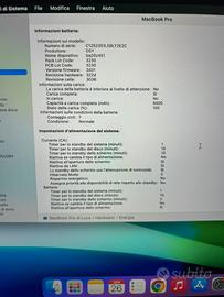 vendo Apple MacBook Pro 2019 in buone condizioni , la batteria è stata appena cambiata da un tecnico, presenta in questo momento sette cicli di ricarica. sono presenti dei graffi esterni sulla scocca evidenziati in foto e un angolo usurato, e gomma nera interna usurata.