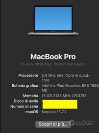 MacBook Pro da 13 pollici, modello del 2019. Un portatile potenteu e versatile. 512 SSD di memoria - Processore: 2,4 GHz Intel Core i5 quad-core - Scheda grafica: Intel Iris Plus Graphics 655 1536 MB - Memoria: 16 GB 2133 MHz LPDDR3