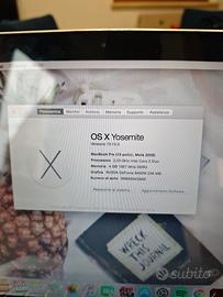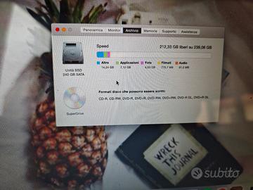 MacBook pro funzionante molto fluido grazie a SSD da 256. guscio superiore e inferiore con adesivo da ripulire. Con alimentatore incluso.