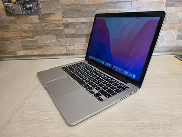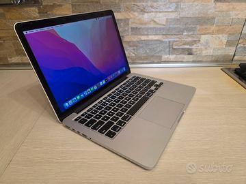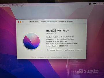 vendo portatile Apple Macbook Pro A1502 del 2015 ,Intel core i5, 8gb ram, 256gb ssd, MacOS Monterey, Batteria ottima con solo 97 cicli di ricarica. Tastiera retroilluminata con Layout US Americana Il Portatile si trova in ottime condizioni generali e perfettamente funzionante con qualche leggero graffio sulla scocca.