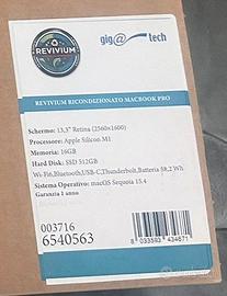 MacBook Pro 13.3" ricondizionato ma mai utilizzato, ancora sigillato (0 utilizzo). Chip Apple M1, 16GB RAM, SSD 512GB, schermo Retina 2560x1600. Wi-Fi 6, Bluetooth, USB-C/Thunderbolt. Batteria 58,2Wh, macOS Sequoia 15.4. Garanzia di 1 anno.
