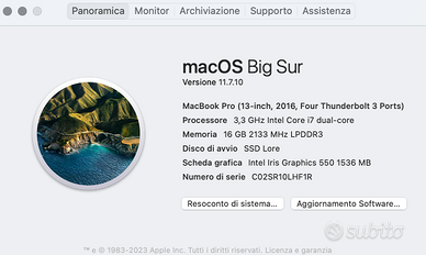 MacBook Pro i7 late 2016 con SSD da 500 GB, display 13'', Touchbar, 16GB RAM, batteria nuova cambiata 5 mesi fa (solo 50 cicli di ricarica - in media arriva a farne 1000). Laptop veloce e performante. Ben tenuto, nessun difetto estetico, a parte qualche piccolissimo graffio.