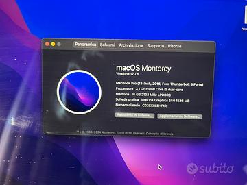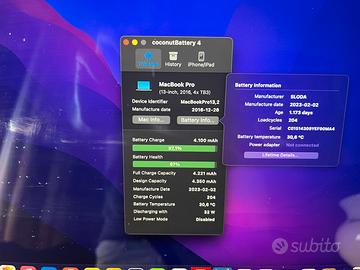 Vendo MacBook Pro Late 2016 con Touch Bar in ottimo stato, info su caratteristiche e batterie presenti nelle foto.