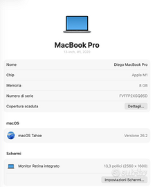 Vendo MacBook Pro 13” (2020) con chip Apple M1, perfettamente funzionante e tenuto con grande cura. 🔹 Caratteristiche principali: Modello: MacBook Pro 13-inch Chip: Apple M1 RAM: 8 GB Display: Retina 13,3” (2560 x 1600) Batteria: Stato normale – Capacità massima 100% Sistema operativo: macOS Tahoe Caricamento batteria ottimizzato attivo 💻 Ideale per studio, lavoro, editing leggero, programmazione e utilizzo quotidiano grazie alle ottime prestazioni del chip M1. 📌 Condizioni: ottime, nessun problema tecnico. 📦 Disponibile per consegna a mano o spedizione. Per info o foto aggiuntive contattami in privato!