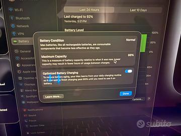 MacBook Pro M1 13" (tastiera inglese, grigio siderale) con 8 GB di RAM, SSD da 256 GB, batteria all'88% e alimentatore da 60 W. Nessun graffio.