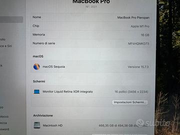Vendo MacBook Pro con processore M1 Pro da 16 pollici, con 16Gb di RAM e 512 Gb di SSD. Perfettamente funzionante e in eccellenti condizioni, usato veramente poco, ha solamente un piccolissimo segno di usura sulla scocca (ultima foto). Incuso anche il caricatore originale. Batteria in eccellenti condizioni ancora al 94%. Spedisco con TuttoSubito, ma disponibile anche il ritiro in zona Chiampo(VI). Per qualsiasi informazione non esitare a contattare.