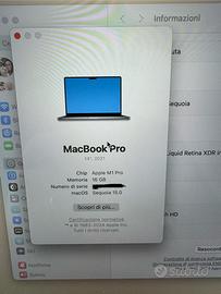 Vendo macbook pro M1 PRO del 2021 con 16gb Ram e 512gb HD completo di caricabatterie e scatola originali…il mac presenta un piccolo graffio sul bordo anteriore dx e dei piccoli graffi dul display come da foto pubblicata.