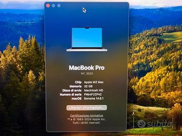 Macbook Pro 2023 M2 Max con 1tb di archiviazione e 32gb di RAM. 14 Pollici. 12 Core CPU 30 core GPU
