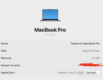 MacBook m2 Max 14 Pollici, con 32 Gb di Ram e 4 TB di Disco. Configurazione praticamente introvabile! vendo con alimentatore originale. Il computer è in perfetto stato, la batteria è all'84% di vita e l'apple Care scade a Giugno 2026. per aziende o liberi professionisti posso anche fatturare