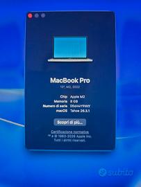 💻 MacBook Pro 13" (2022) - Chip M2 | Grigio Siderale Vendo MacBook Pro 13 pollici con chip Apple M2, acquistato nel 2023. La macchina è perfetta per studenti, creator o professionisti che cercano potenza e una batteria che dura letteralmente tutto il giorno. ⚙️ Specifiche Tecniche: Chip: Apple M2 (estremamente veloce e silenzioso) RAM: 8GB (gestione multitasking ottimizzata Apple Silicon) SSD: 256GB ultra-veloce Display: Retina 13.3" (colori spettacolari per foto e video) Sicurezza: Touch ID per sblocco rapido e pagamenti Plus: È l'ultimo modello con la comodissima Touch Bar ✅ Condizioni e Accessori: Stato: Sempre tenuto con cura, nessun graffio evidente sul display o sulla scocca. Corredo: Include scatola e cavo originale.