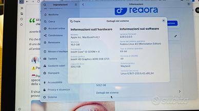Vendo per passaggio a modello superiore, questa è l’ultima versione professionale Apple completamente modulare ed espandibile. Il macbook è stato potenziato è perfetto per archiviazione, navigazione fluida, smart working e programmi di grafica leggera. Specifiche Tecniche: Processore: Intel Core i5; RAM: 16GB DDR3 (il massimo supportato, per gestire molte schede e app aperte). Archiviazione: 512g SSD (velocissimo). Display: 13 pollici lucido. Grafica: scheda video Intel® HD Graphics 4000 (IVB GT2). Batteria: APPENA SOSTITUITA (17 cicli). Garantisce autonomia come da nuovo. Porte native: È dotato di porta Ethernet, FireWire 800, 2x USB 3.0, Thunderbolt e lettore SD Card (non servono adattatori!);lettore cd. Manutenzione: A differenza dei modelli successivi, qui tutto è accessibile e riparabile. Buone condizioni generali nessun problema. Sistema Operativo: Consegnato con installazione pulita di Fedora Workstation molto simile a mac os ma 10 volte più fluido e veloce (si può sempre tornare a catalina). Includo alimentatore compatibile MagSafe da 60W. Prezzo leggermente trattabile dopo visione.