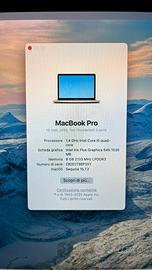 Vendo MacBook Pro, anno fine 2020. Modello con TouchBar. Display Retina retroilluminato LED da 13,3 pollici, processore Intel Core i5 quad-core a 1.4GHz . RAM: 8GB ARCHIVIAZIONE: SSD da 256GB Due porte Thunderbolt 3 (USB-C), colore Space Gray. MacBook perfettamente funzionante, tenuto in modo maniacale. Zero graffi, nessun segno di usura. Regalo anche cover.