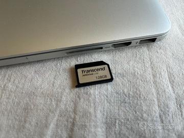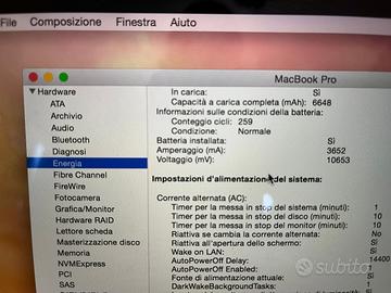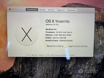 MacBook Pro retina mid 2014. Memoria SSD Apple 128 Gb + estensione 128 Gb nello slot di SD card. Processore 2,6 GHz Intel Core i5 Memoria RAM 8 Gb 1600 MHz DDR3 Batteria sostituita da un anno con soli 286 cicli di carica (autonomia di lavoro pari al nuovo) Ottime condizioni generela, tenuto sempre in guscio protettivo.