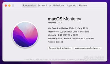 Vendo causa inutilizzo Macbook Pro Retina (early 2015), versione con Intel Core i5 dual-core a 2,9GHz (Turbo Boost fino a 3,3GHz) con 3MB di cache L3 condivisa, SSD da 1Tb.