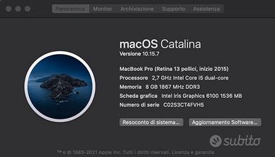 Vendo MacBook Pro 13 pollici Retina, modello inizio 2015, in ottime condizioni e appena ripristinato alle impostazioni di fabbrica. Pronto per essere configurato dal nuovo proprietario. Perfettamente funzionante.