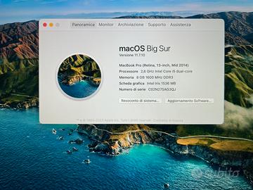 Vendo per inutilizzo Macbook pro retina 13" con 8GB di ram e ssd 256GB. 100% funzionante completo di caricabatterie e scatola.