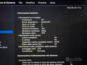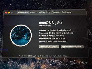 Vendo MacBook Pro Retina 13 pollici (Mid 2014) perfettamente funzionante e pronto all’uso. Specifiche tecniche: - Processore Intel Core i5 2.8 GHz - Memoria RAM 8 GB - SSD 250 GB - Schermo Retina - macOS Big Sur installato Accessori inclusi: - Scatola originale - Caricatore originale - Adattatore Ethernet Apple - Cavo Thunderbolt Apple Condizioni: - Funzionamento perfetto - Batteria in ottimo stato (280 cicli) - Nessun problema hardware - Normali segni di utilizzo Verrà consegnato con iCloud disattivato, Mac inizializzato e pronto per un nuovo utente. Ideale per studio, lavoro e utilizzo quotidiano. Contattami per ulteriori informazioni o foto.