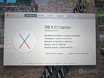 Vendo macbook pro retina 13 pollici acquistato nel 2014. Processore intel core i7 2,8GHz con memoria 8Gb. Il computer é funzionante ma non si aggiorna piu. Accetto offerte.