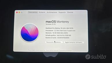 Vendo macbook pro retina (mid 2015) Modello con processore i7 e 16gb di ram (era il modello di punta, dispongo di fattura di 2500 euro d’acquisto), tutt’oggi super efficace e veloce per ogni lavorazione d’ufficio ed editing fotografico Sistema operativo monterey 12.7.5 La batteria è stata sostituita oggi 22/04/2026 con una originale apple nuova (vedi ultima foto) assieme è stato ovviamente pulito completamente ed è stata sotituita la pasta termica Presenta leggeri segni di usura sulla tastiera per via dell’età ma la scocca è perfetta in tutto, lo cedo assieme alla sua scatola originale (dov’è tutt’ora) ed il caricabatterie originale Disponibile per altre foto/video dell’utilizzo o anche a farlo provare se interessati all’acquisto Accetto offerte sensate, solo la batteria è costata 150€