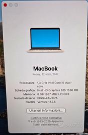Apple MacBook Retina 12-Inch modello 2017, acquistato nuovo nel 2020 Processore: 1,3 Ghz Intel Core i5 dual-core Scheda GRafica : Intel HD Graphics 615 1536 MB Memoria: 8 GB 1867 MHz LPDDR3 macOS : Ventura 13.7.8