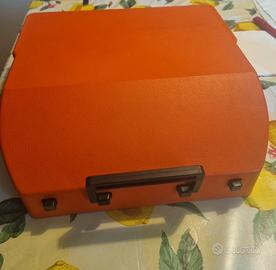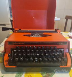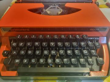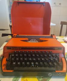 Macchina per scrivere portatile anni '70 marchio Primavera 2000 di colore arancione con custodia rigida per il trasporto. In ottimo stato e ancora funzionante, ma necessita della sostituzione del nastro.