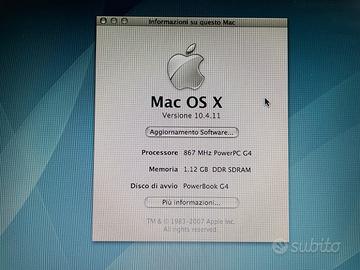 Il processore PowerPc G4 è la versione a 867MHz, con RAM espansa a 1.2 GB (massimo possibile per questa macchina), un hard disk IDE da 2.5" da 75Gb e un lettore CD-DVD, tutti perfettamente funzionanti.