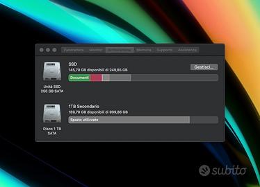 2 HD interni distinti: il primo è un SSD 250 GB Sata Samsung EVO, il secondo un HD meccanico da 1TB a 7200 rpm (comodo per farti i backup)