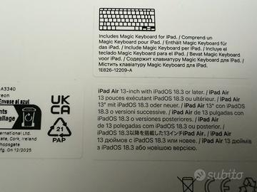 Vendo Magic Keyboard per iPad Air 13”, colore nero, nuovissima. Acquistata il 15 aprile presso Apple Store, mai utilizzata: è praticamente come comprarla nuova. La vendo perché pensavo di usarla, ma non mi ci trovo. Completa di scatola originale e scontrino. Prezzo di acquisto: € 349,00 (verificabile dallo scontrino). Consegna a mano a Milano e provincia, previo accordo, oppure spedizione tramite Subito con tracciabilità. Massima serietà