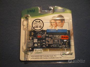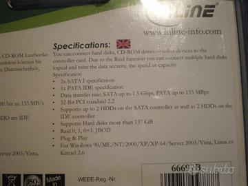 Fornito con cavo di collegamento eide e scheda controller aggiuntiva PCI per installazione su schede madri con slot PCI e senza interfaccia di collegamento EIDE presente (la scheda presenta possibilità anche di un collegamento SATA ed uno e-SATA).