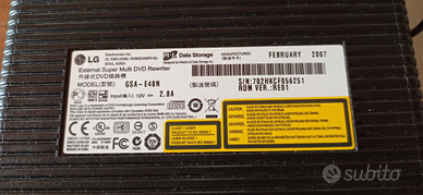 masterizzatore esterno LG super multi DVD, modello GSA-E40N, completo di alimentatore e cavo USB
