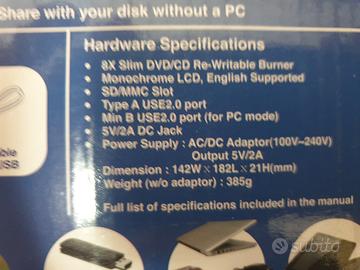 Plextor PlexEasy PX-650US. Colore del prodotto: Bianco, Meccanismo caricamento: Vassoio. Tipo drive ottico: DVD±RW, Interfaccia: USB 2.0, Tipi di dischi supportati: CD-R,CD-ROM,CD-RW,DVD+R,DVD+R DL,DVD+RW,DVD-R,DVD-R DL,DVD-RAM,DVD-ROM,DVD-RW. Velocità di scrittura CD: 24x, Velocità di riscrittura CD: 24x, Velocità di scrittura CD-R: 24x. Velocità di lettura CD: 24x, Velocità di lettura CD-R: 24x, Velocità di lettura CD-RW: 24x. Larghezza: 142 mm, Profondità: 182 mm, Altezza: 21 mm