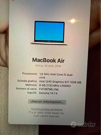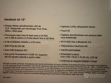 Vendo , come da foto in annuncio MCBOOK AIR 13,3” RETINA retroilluminato LED – Processore intel core i5 dual-core a 1,6 ghz , turbo boost fino a 3,6 ghz – 8GB di sdram a 2133 Mhz – ssd pcie da 128 gb – intel UHD graphic 617 – 1536 mb. Il PC e’ pari al nuovo , unico proprietario .