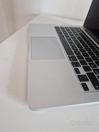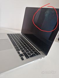 Mcbook Pro Retina 13.3 pollici. Late 2013. Processore 2.4 GHZ INTELCORE 15.2 CORE Ram 8 Gigabite. 1600 MHZ DDR3. Archiviazione hard disk Macintosh HD 128 GBITE Sistema operativo: macOS BIG SURE Versione 11.7.10. Scheda grafica INTEL IRIS 1536 MB. Il computer funziona benissimo, è presente solo una lieve imperfezione estetica e non funzionale sullo schermo che non influenza minimamente la definizione quando è acceso. Le casse esterne non sono funzionanti, tuttavia in cuffia (con o senza fili) l'audio è perfetto La scatola non è inclusa.