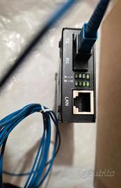Media converter monofibra perfettamente funzionante completo di alimentatore bretella ottica e cavo LAN.