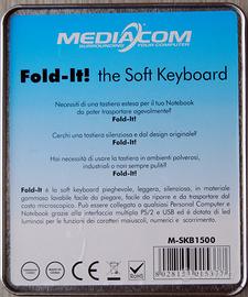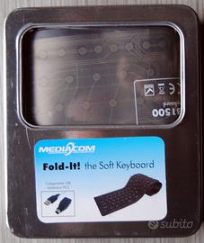Tastiera SOFT in gomma completamente pieghevole, prodotto della Mediacom, nuova nella scatola metallica originale, munita di istruzioni, cavo USB e trasformatore da Usb-PS2. Perfetta anche per fare un regalo.