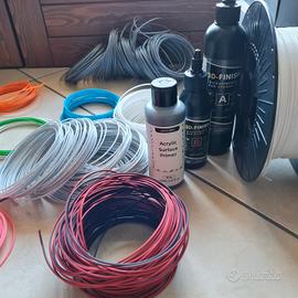 Vendo per inutilizzo stock completo per stampa 3D composto da: 7 Bobine (1 PETG bianco nuovo/pieno + 6 bobine avviate di vari colori). 9 Matasse di PLA sfuso per test e campionature. 1 Surface Primer Grigio (pieno). Set Resine A+B (usate una volta, scadenza Luglio 2026 -). In regalo: Nozzle 0.4mm per Anycubic Kobra S1 (non funzionante, per ricambi).