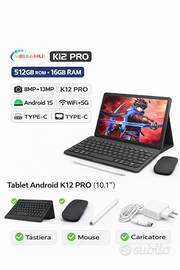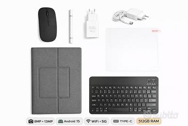 🔹 Caratteristiche principali: • Display ampio ad alta definizione • Memoria interna 512GB ROM • 16GB RAM per massime prestazioni • Supporto rete 5G / 4G • Sistema operativo Android 15 • Processore Octa-Core veloce e fluido • Batteria super capiente da 10.000 mAh • Fotocamera posteriore integrata 📦 Accessori inclusi nel kit: ✔ Tastiera wireless ✔ Mouse wireless ✔ Penna touch / stilo ✔ Caricatore ✔ Cavo ricarica