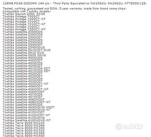 128MB PC66 SODIMM 144 pin - Third Party Equivalent to NW2062U, PA2062U, KTT8000/128. Per Toshiba Satellite, Portege, Tecra modelli vecchi anni 2000 Compatibile con: - Toshiba Equium 2000 PC66 - Toshiba Portege 7000CT, 7000CT-NT, 7010CT, 7010CT-NT, 7020CT, 7020CT-NT - Toshiba Satellite 2060CDS, 2065CDS, 2550CDT, 2590CDS, 2595CDS, 2595CDT, 2595XDVD, 2610CDT DVD, 2615 DVD, 2655 XDVD, 4000CDS, 4000CDT, 4005CDS, 4005CDT, 4010CDS CDT, 4015CDS CDT, 4020CDT, 4025CDT, 4030CDS, 4030CDT, 4030CDT-NT, 4060CDT, 4060CDT-NT, 4060XCDT, 4070CDS, 4070CDT, 4080XCDT, 4080XCDT-NT, 4090CDS, 4090XDVD XCDT, 4090XDVD-NT, 4100XCDT, 4100XCDT NT, 4100XDVD, 4100XDVD-NT - Toshiba Tecra 8000 PII233, 8000 PII266, 8000 PII300, 8000 PII333, 8000 PII366, 8000 PII400