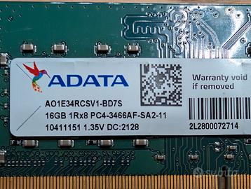 Vendo banco singolo di memoria RAM per portatile (o Mini PC) ad alte prestazioni. Si tratta di un modulo ADATA da 16GB, ideale per l'upgrade di laptop da gaming o per espandere la memoria del proprio sistema compatto. Perfettamente funzionante e in ottime condizioni. Specifiche tecniche: Marca: ADATA Capacità: 16 GB (1x16GB) Formato: SO-DIMM (per Notebook / Laptop / Intel NUC) Tipologia: DDR4 Frequenza: 3466 MHz (PC4-3466AF) Configurazione: 1Rx8 (Single Rank) Voltaggio: 1.35V Codice Modello esatto: AO1E34RCSV1-BD7S Nota bene per la compatibilità: Trattandosi di un banco ad alta frequenza (3466 MHz) e voltaggio di 1.35V, vi invito a verificare che la scheda madre del vostro portatile supporti queste specifiche (spesso gestite tramite profili XMP) o che sia identico a quello già montato nel vostro PC per sfruttare il Dual Channel senza problemi.