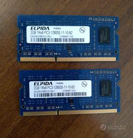 Vendo moduli Memorie RAM SODIMM per PORTATILE testate e funzionanti. Per computer pc portatile, netbook. Di seguito elenco e prezzi: - 1 BANCO ram notebook so-dimm DDR3L 4GB 1600MHz samsung M471B5173DB0-YK0 (15 euro) - DUE BANCHI ram macbook pro 4gb (2x2gb) so-dimm ddr3 1600mhz pc3-12800s Elpida EBJ20UF8BDU0-GN-F (25 euro) - 1 BANCO ram notebook so-dimm DDR4 4GB 2666MHZ RAMAXEL RMSA3270ME86H9F-2666 (20 euro)