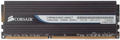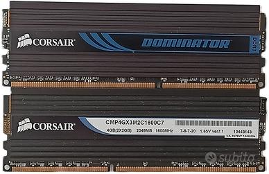 KIT 2 MODULI DI MEMORIA RAM CORSAIR DOMINATOR 2 x 2 GB (4 GB) – DDR3 -1600 MHz BEN CONSERVATE (QUASI COME NUOVE). TESTATE. PERFETTAMENTE FUNZIONANTI. MODELLO CMP4GX3M2C1600C7 VOLTAGGIO DI FUNZIONAMENTO 1,65 V NON ECC, UNBUFFERED DIMM (CHIPS SU ENTRAMBE LE FACCE)