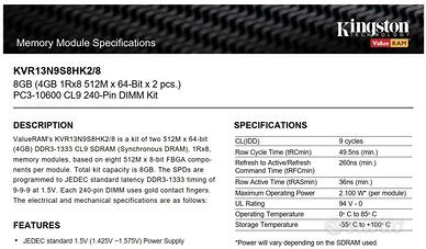 Vendesi 4 banchi di memoria ram DDR3-1333 Mhz Kingston kit KVR13N9S8HK2/8 Ogni banco di memoria ram e' da 4gb, totale 16gb con tutte e 4 le DIMM