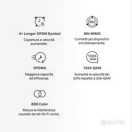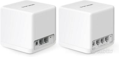 PERFETTAMENTE FUNZIONANTI COME NUOVI, COMPLETI IN CONFEZIONE ORIGINALE Rete unificata – Grazie alla tecnologia Mesh, le unità Halo creano una rete wireless con un unico nome e password per connessioni senza interruzioni. Wi-Fi 6 Dual Band – Goditi velocità di connessione fino a 1500Mbps, 1201Mbps in 5 GHz e 300Mbps in 2.4 GHz. † Seamless roaming – I dispositivi connessi passano da un'unità Halo all'altra senza perdita del segnale, in modo da assicurarti sempre la connessione più veloce e il segnale migliore. ‡ Piena copertura per la tua casa – 3 unità fino a 550 m² con un Wi-Fi dalle alte prestazioni, ideale per case di grandi dimensioni. † Connetti tutti i tuoi dispositivi – La rete Halo supporta fino a 100 dispositivi. † App Control – L'app MERCUSYS permette di installare e gestire la rete Mesh in modo rapido e semplice. Porte Gigabit – L'unità Halo Router dispone di 3 porte Gigabit per connessioni cablate ultra rapide. **