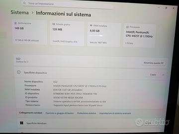 ** 180eur ** Vendo Surface Go 2 8gb. Il computer è perfettamente funzionante, aggiornato, in più che buone condizioni. Specifiche tecniche: -CPU Intel Pentium 4425Y 1.7ghz -RAM 8Gb DDR2 -Storage SSD 149gb -GPU Intel UHD 615 -Display Touch 10.5 1920x1280 -WiFi, SD-card, Webcam, Bluetooth etc Il tablet è in buone condizioni, perfettamente funzionante. Incluso alimentatore originale, tastiera magnetica, penna con punte di ricambio, borsa compatibile. Eventualmente posso aggiungere una docking type-c per collegare hub LAN e monitor esterni. Batteria con buona durata (fino a 3h guardando film). Windows 11 aggiornato. Possibile vederlo in FVG, eventualmente spedisco con +9eur. Non scambio con niente, solo vendita. Non rispondo a proposte a ribasso.