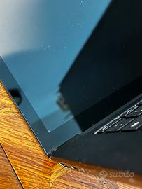 Il computer presenta delle ammaccature sui lati, come visibile in foto, date dall'uso, che si estendono su tutta la scocca esterna. In particolare, ha un segno sull'angolo destro inferiore a seguito di una caduta. Questo impatto ha danneggiato il meccanismo della cerniera di chiusura, comportando un disallineamento tra le due metà del computer (vedere foto). Tuttavia, si precisa che la struttura mantiene la sua solidità e le componenti risultano ben salde. Questo non comporta nessun difetto funzionalem ma è comunque un difetto estetico che è necesario sottolineare.
