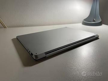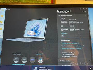 Vendo Microsoft Surface Laptop 5 (Modello 1950/1951) acquistato meno di un anno fa. Il computer è stato usato pochissimo ed è in condizioni impeccabili, sempre tenuto con cura. Batteria ancora al 100%, mai avuto problemi di autonomia. Caratteristiche principali: -Schermo: 13,5" (2256 x 1504) -Processore: Intel Core i5-1235U 12th gen -RAM: 8 GB -SSD: 256 GB -GPU: Intel Iris Xe -Windows 11 Home -Colore: Platinum -Batteria in salute perfetta (100%) Condizioni Il PC è come nuovo, veloce, silenzioso e perfetto sia per studio che per lavoro, incluso il caricatore originale e confezione. Unica pecca: le gommine sotto la scocca si sono staccate, non influiscono sul funzionamento (si trovano facilmente a pochi euro su Amazon).
