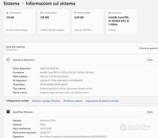 NON SPEDISCO NON SPEDISCO NON SPEDISCO Microsoft Surface Pro 7 con Intel Core i5-1035G4 (12,3-pollici, 8GB RAM, 128 GB SSD) Tastiera retroilluminata Surface pen-Alimentatore (il tutto originale) Ecco le caratteristiche dettagliate dell'i5-1035G4: Processore: Intel Core i5-1035G4 Quad-Core, 10ª generazione (frequenza base 1.10 GHz, turbo fino a 3.70 GHz). Grafica: Intel Iris Plus Graphics. Memoria RAM: 8 GB GB LPDDR4x. Archiviazione: SSD da 128 GB, Display: 12.3" PixelSense, risoluzione 2736 x 1824 (267 PPI), proporzioni 3:2, tocco multi-touch a 10 punti. Porte: 1x USB-C®, 1x USB-A 3.0, Jack audio 3.5mm, 1x porta Surface Connect, lettore di schede MicroSDXC. Connettività: Wi-Fi 6 (802.11ax), Bluetooth 5.0. Fotocamere: Frontale 5.0 MP (video 1080p, Windows Hello), Posteriore 8.0 MP (video 1080p, autofocus). Audio: Altoparlanti stereo da 1.6W con Dolby Audio. Sistema Operativo: Windows 11 Pro