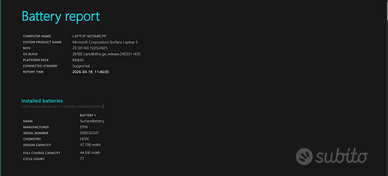 💻 **Microsoft Surface Laptop 5 – i7 / 16GB RAM – Ottime condizioni** Vendo Microsoft Surface Laptop 5 acquistato nel 2022, utilizzato sempre con molta cura e perfettamente funzionante. * Processore Intel i7 12ª generazione (i7-1255U) * 16 GB RAM * Windows 11 originale * Design sottile, leggero e premium (tipico Surface) * Ideale per lavoro, studio e utilizzo professionale 🔋 **Batteria:** * Stato eccellente (~94% capacità residua) * Solo 77 cicli di ricarica * Report completo disponibile su richiesta 🔹 **Condizioni:** * Nessun problema tecnico * Utilizzo principalmente da ufficio * Sempre tenuto con attenzione * Completo di scatola, alimentatore e custodia extra in tessuto 🔹 **Motivo vendita:** Cambio dispositivo 💰 **Prezzo: 990 € trattabili** 📍 Consegna a mano preferita / spedizione disponibile