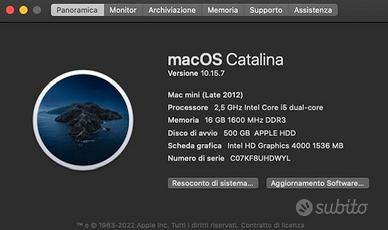 Mini Mac late 2012 Memoria 16 GB 1600 MHz DDR3 Disco di avvio 500 GB APPLE HDD Scheda grafica Intel HD Graphics 4000 1536 MB Preferisco scambio a mano
