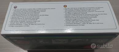 Server Mini NAS DIGITUS per HDD USB esterno Mini adattatore che permette di collegare a una porta LAN RJ45 un dispositivo USB. Ha una porta USB 2.0 e 1 porta RJ45. Con funzione NAS (Network Attached Storage) che fornisce accesso ai dati di una rete. Si può quindi usare per fornire memoria per espansione, condivisione e backup per l'intera rete. L'installazione è semplice e l'amministrazione avviene tramite interfaccia web. Server NAS DIGITUS per HDD esterno purchè sia alimentato, chiavetta USB, FTP, server Samba, fino a 1,5 TB 1x USB 2.0, 1x 10/100 Mbps LAN Il server mini NAS consente l'accesso in rete ai dischi rigidi USB 2.0 Funzione NAS (Network Attached Storage) per fornire accesso e memorizzazione centralizzati dei dati sulla rete Fornisce in modo semplice spazio di archiviazione per l'espansione, la condivisione e il backup dei dati in tutta la rete Connettore di rete RJ45 per Fast Ethernet 10/100 Mbps Server Samba e FTP per un facile accesso ai file Server BitTorrent per il download automatico, anche quando il computer è spento Facile accesso a foto, filmati o musica su iTunes, Xbox 360 e Playstation 3 Consumo di energia 2,5 Watt Supporta Windows 11, 10, 8, 7, Vista, XP, Mac OS X e Linux